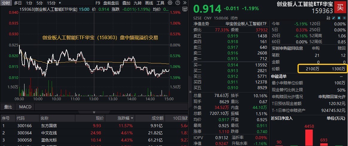 热门ETF方面,继前一日场内大涨超6%后,全市场首只的创业板人工智能ETF华宝(159363)震荡回调,场内价格收跌1.19%,全天成交额超7200万元,换手率超10%,交投维持高度活跃。盘中频现溢价交易,资金逢跌加仓,Wind实时申购数据显示,该ETF今日获资金净申购800万份。